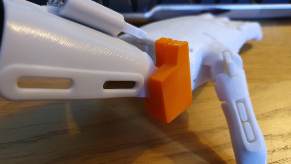 Le bloqueur de poignet sert, comme son nom l’indique, à immobiliser paume et gantelet avec le bon angle de 30° le temps de faire le câblage en toute sérénité.