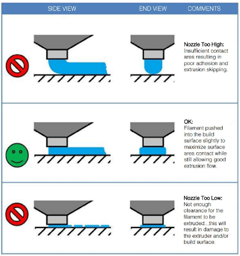 The distance from the nozzle to the bed is critical for a good first layer, which should be even in thickness, a little squashed but not too much.
