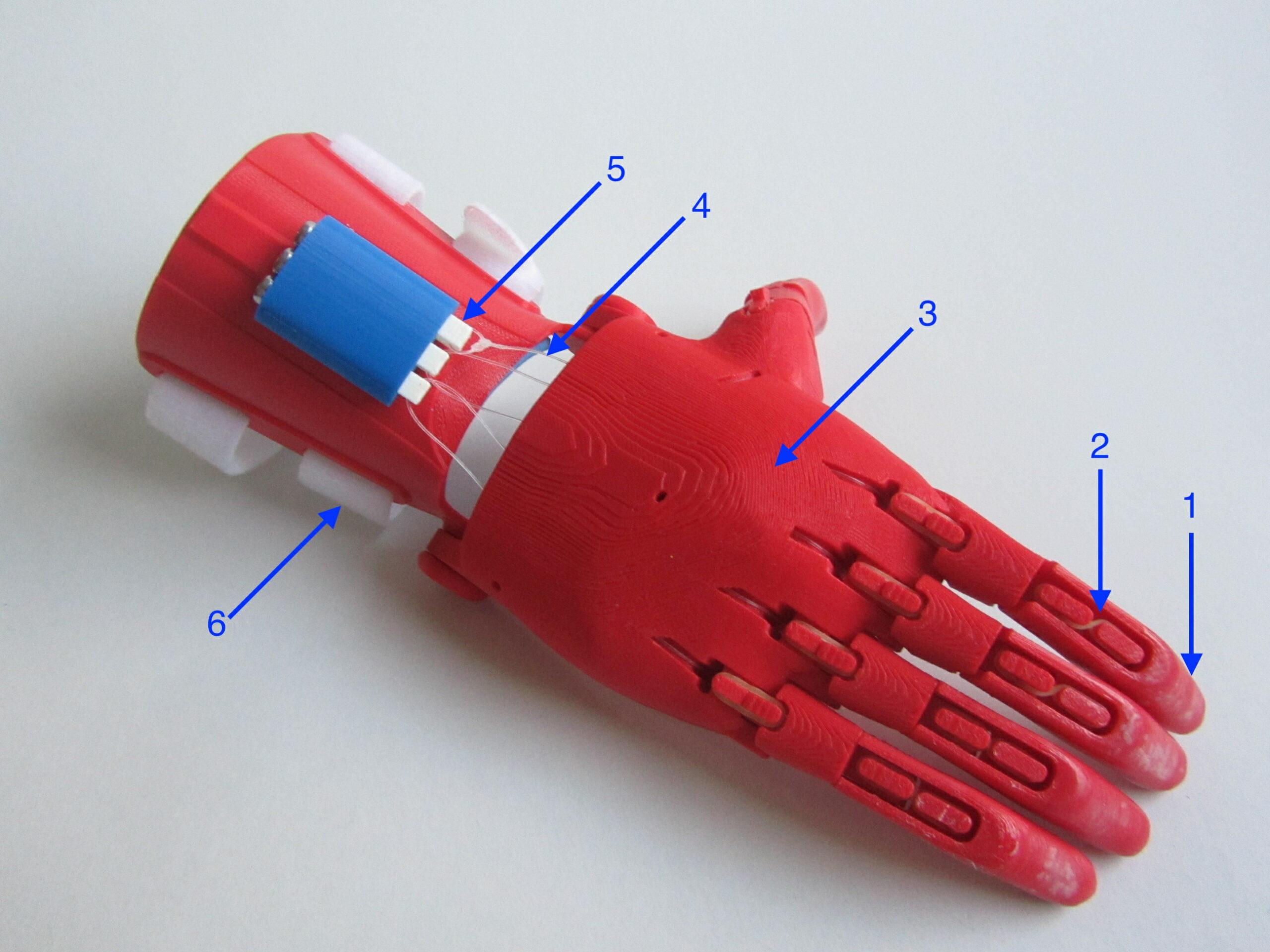 • Except for the thumb, the tendons are not knotted but must slide freely in the eyes of the tensioner pins. The thread is single strand nylon thread, non-elastic, non-woven, with a diameter of 0.4mm to 0.6mm depending on the size of the hand.