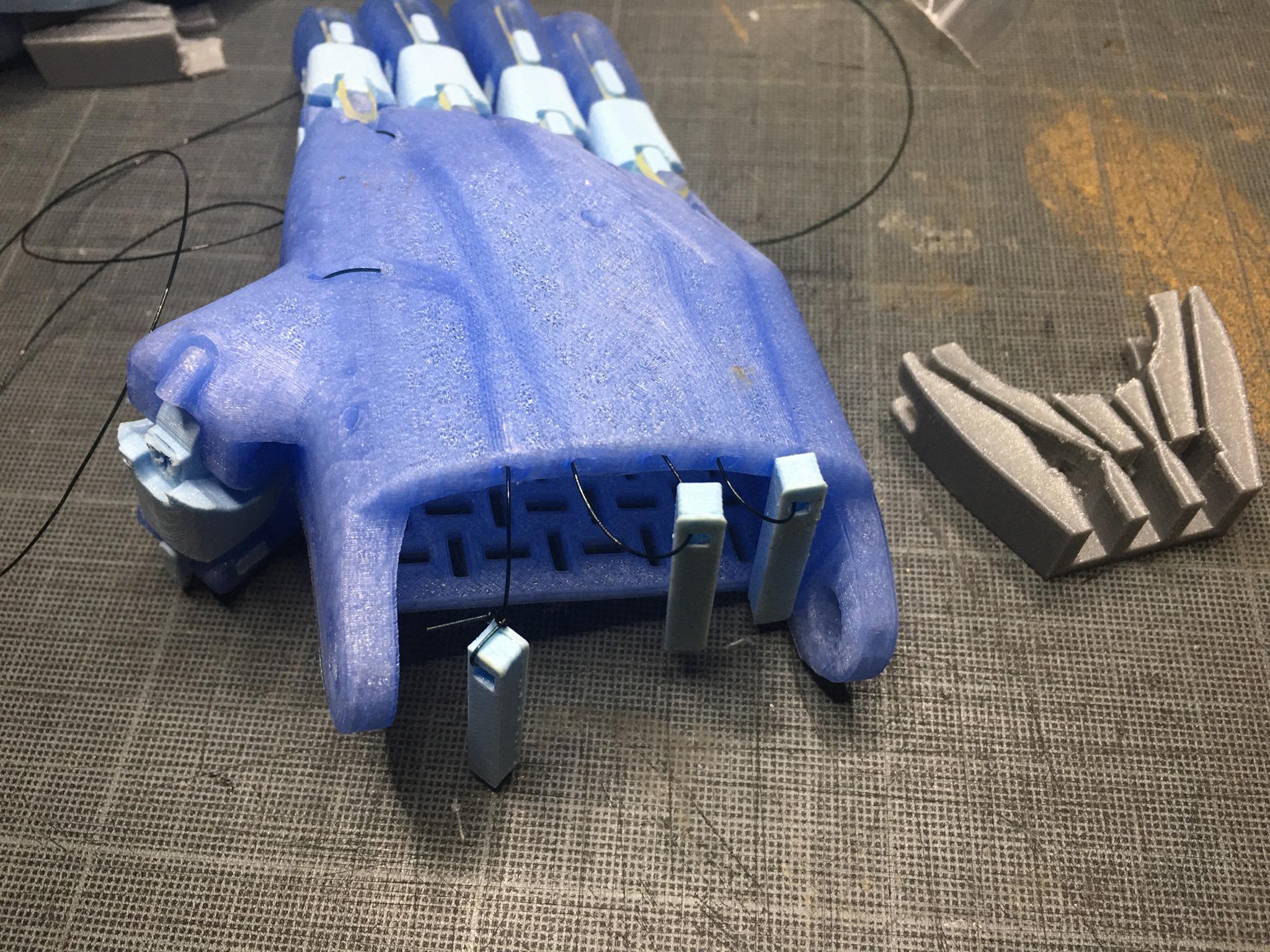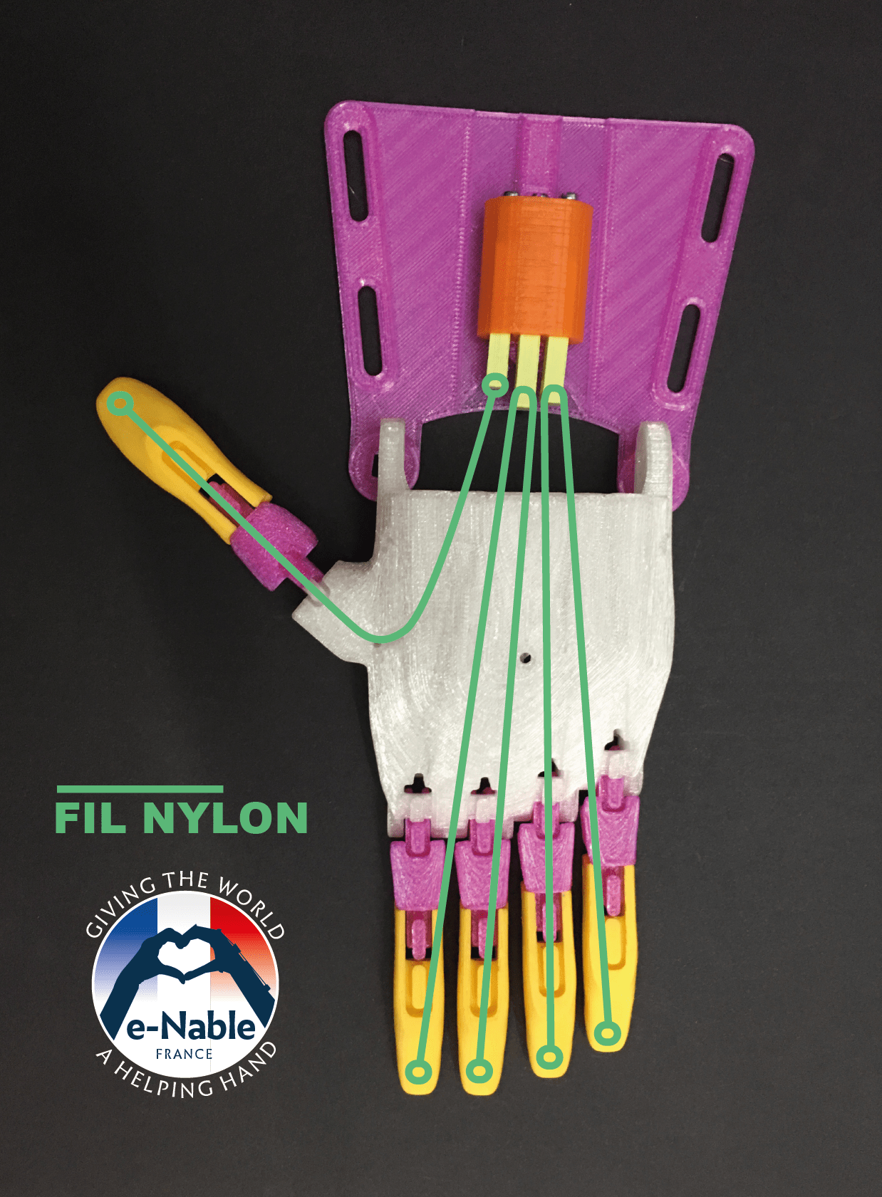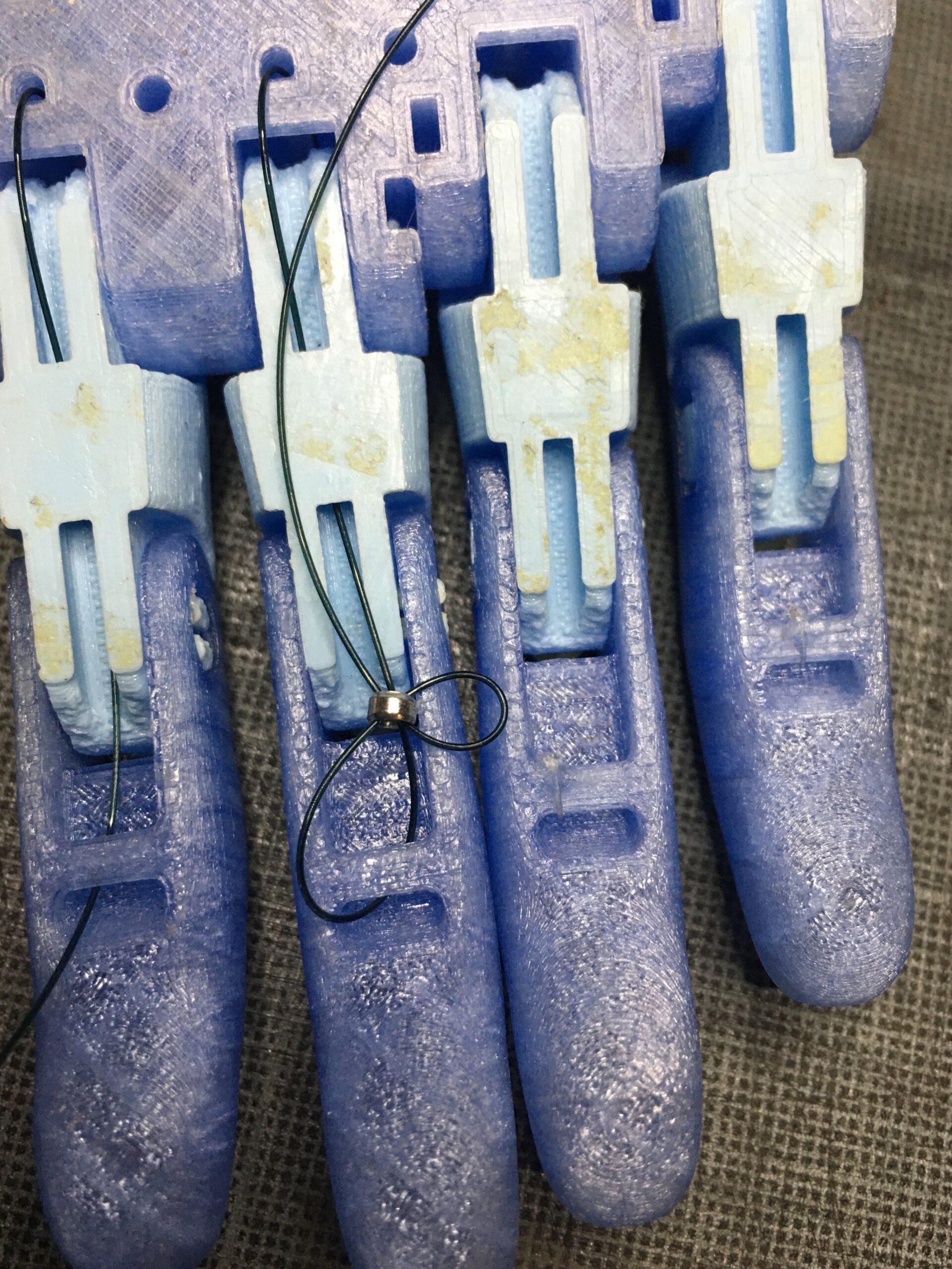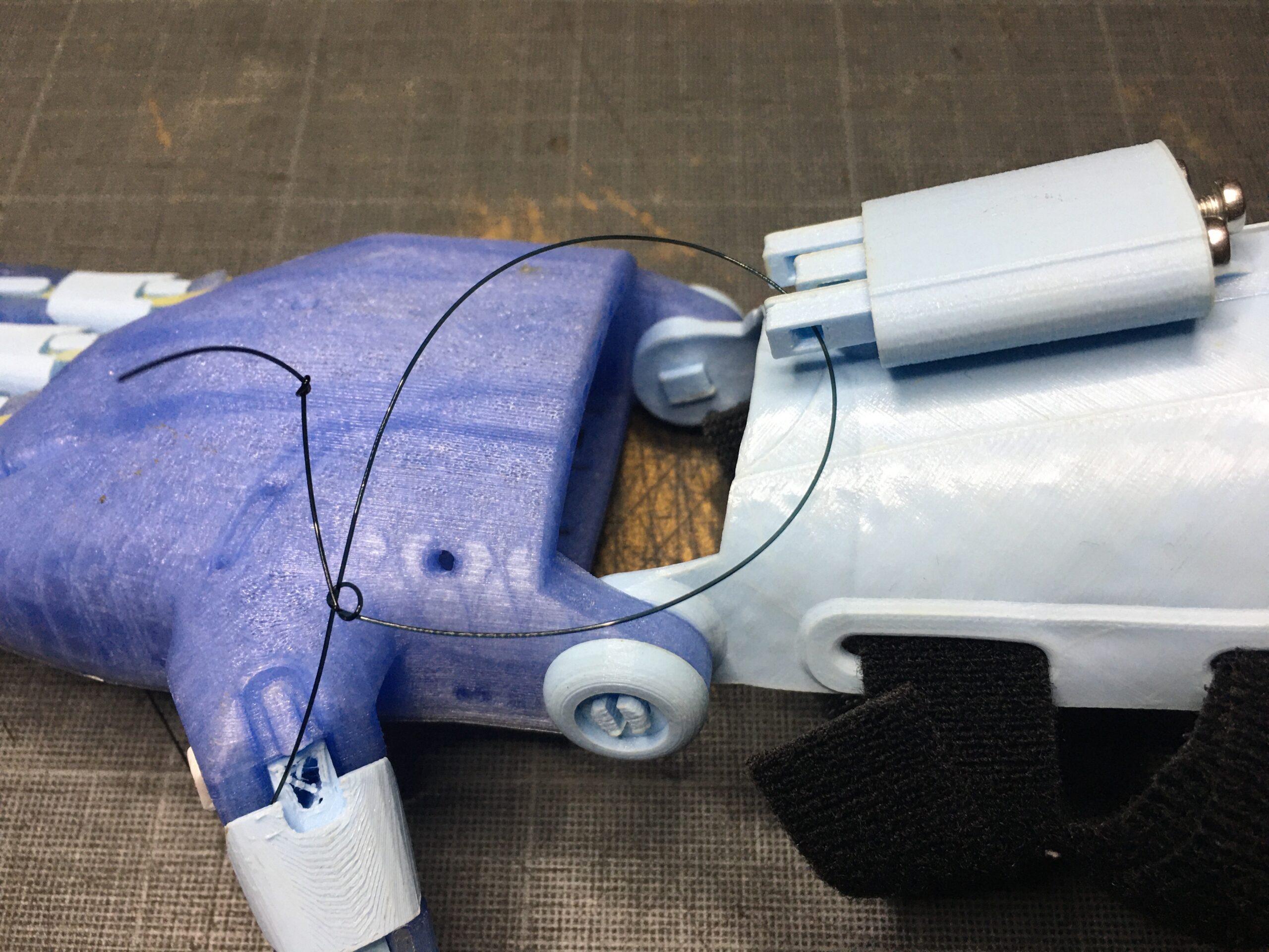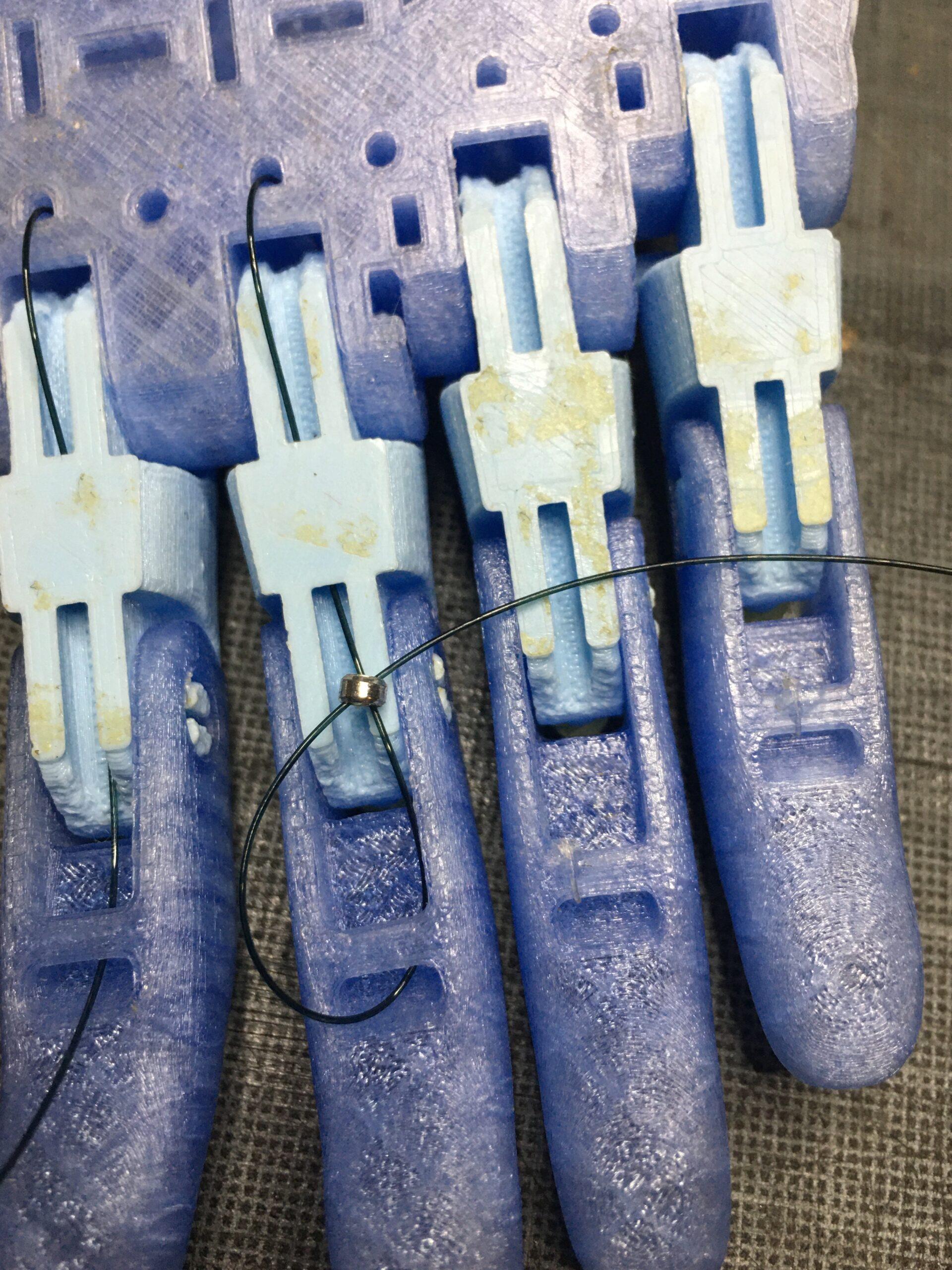 The tendons are in non-elastic monofilament nylon thread. They are used to close the fingers when the user bends the wrist or the elbow, depending on the device, hand or arm.