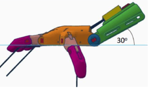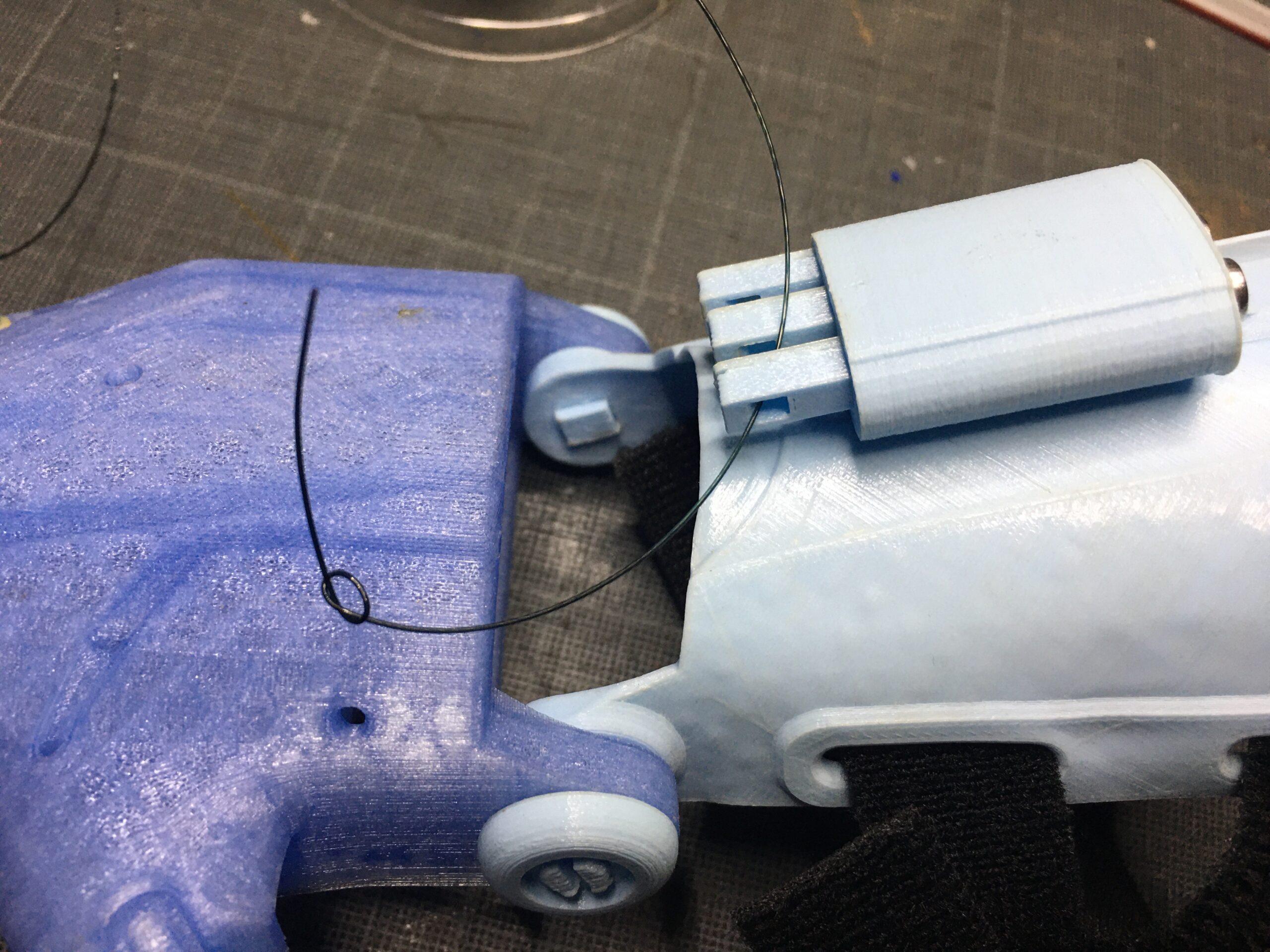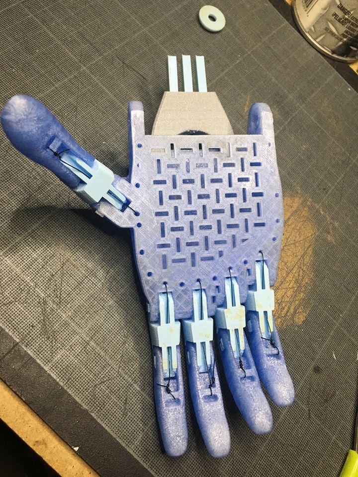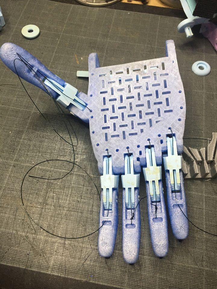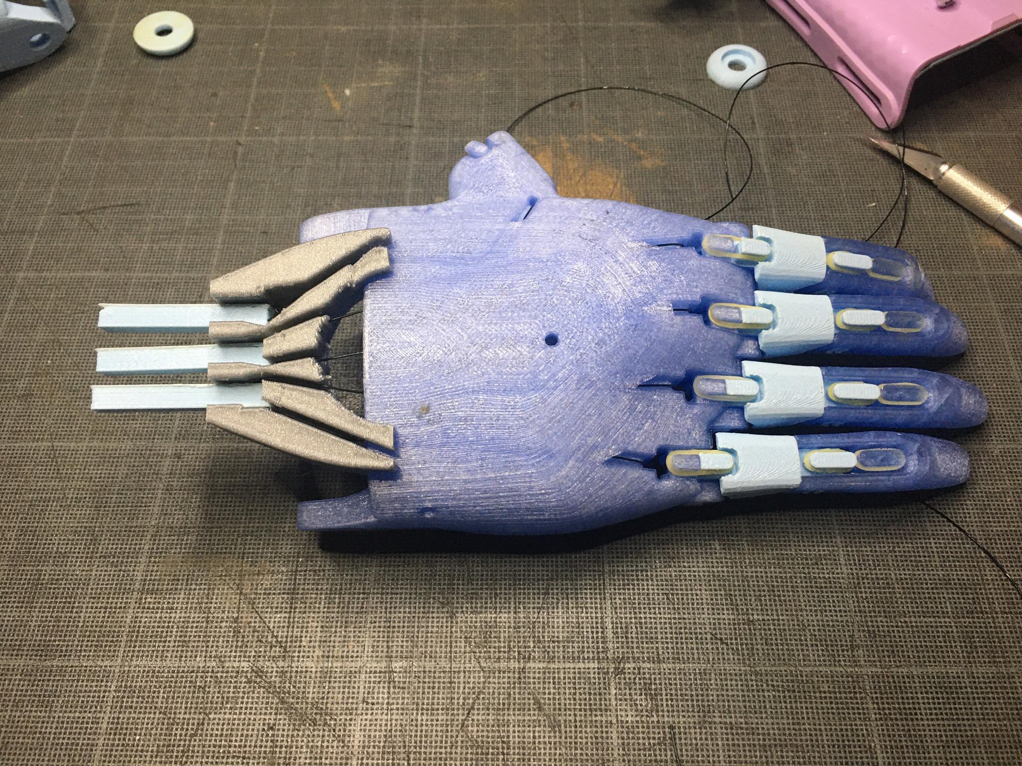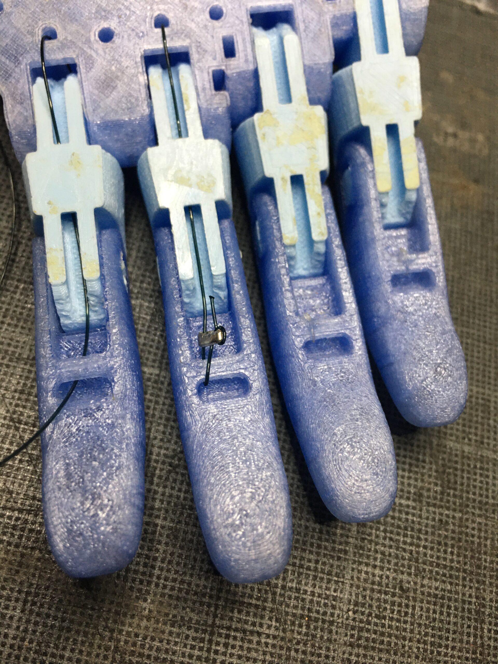 The tendons are in non-elastic monofilament nylon thread. They are used to close the fingers when the user bends the wrist or the elbow, depending on the device, hand or arm.