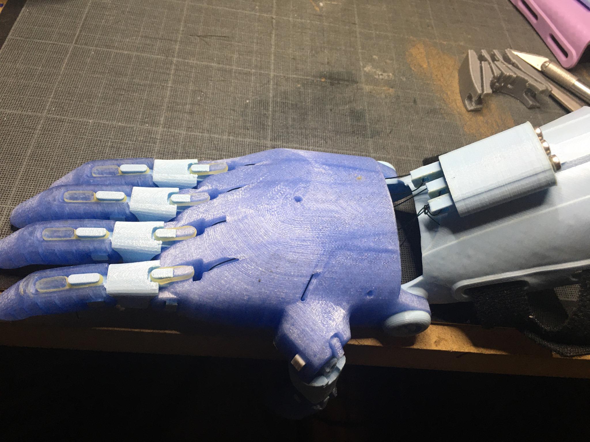 The wiring is finished, by operating the device (pressing the gauntlet while keeping the palm in position) the fingers should close.
